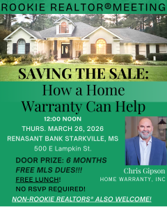 Come join us for the Rookie REALTOR® Group Meeting on March 26th, NOON at Renasant Bank – Starkville.